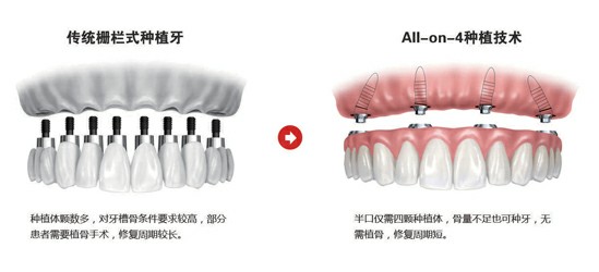 “All-on-4”全口种植牙是一种针对半口或全口牙种植的修复方案,用较少的种植体实现使用功能,仅需每个单颌种植四个种植体即可支撑半口的牙桥。植入种植体后即刻安装固定牙桥,通常无需植骨,克服了传统种植牙槽骨不足无法种植的缺陷。