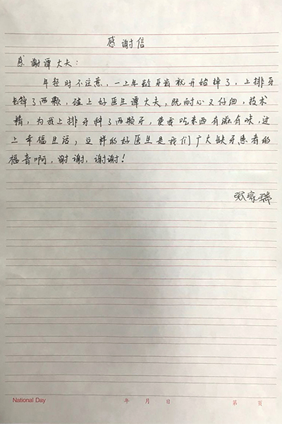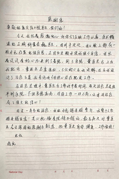 迄今为止,康贝佳口腔已经帮助无数牙齿缺失、牙齿不齐等患者重新塑造了美丽,他们纷纷给康贝佳送来了感谢信和锦旗,述说真实的感受以及对康贝佳的评价。特别是种植科的吴高谊博士、谭学举医生,正畸科的董泰巍医生,受到了一致好评。现特将部分感谢信在大连康贝佳口腔的官网公开(为保护个人隐私,感谢信的署名将不显示),让更多的求美者可以体会到真实的感受,以供选择和参考。