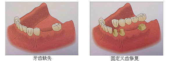 1、固定义齿:一般要把缺牙区两端或一端的天然牙(或牙根)磨小作为基牙(桥墩),然后做成人工牙(连成一体)套上去,用粘结剂粘结固定在基牙上,依靠邻牙支持和固定。